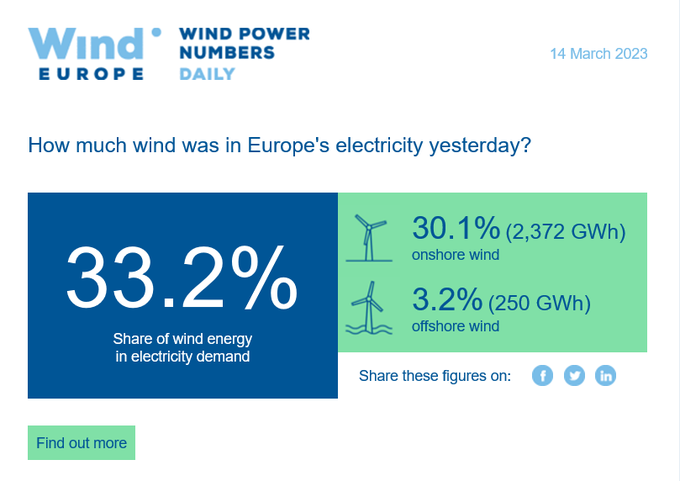 Según los datos publicados por WindEurope, la asociación de energía eólica de la región, la energía eólica representó el 33,2% de la electricidad generada el lunes 13 de marzo.