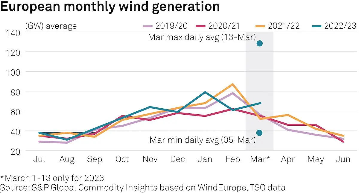 Por otra parte, aunque basándose al menos en parte en los datos de WindEurope, S&P Global Commodity Insights informó de que la generación eólica y solar europea alcanzó un máximo de 186 GW el lunes, lo que según ellos es "el pico de producción horaria combinada más alto registrado por los datos del sistema".