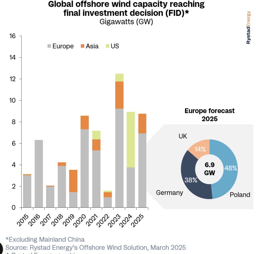 El Reino Unido, Polonia y Alemania liderarán el aumento de las FID europeas en 2025, alcanzando los 9,5 GW, con varios proyectos en estos países en vías de aprobación final. Se espera que, en Polonia, en particular, varios parques eólicos importantes alcancen la FID, incluidos Polenergia y Baltyk II y III de Equinor, tras la reciente FID para Orsted y Baltica 2 de PGE a fines de enero de 2025.
