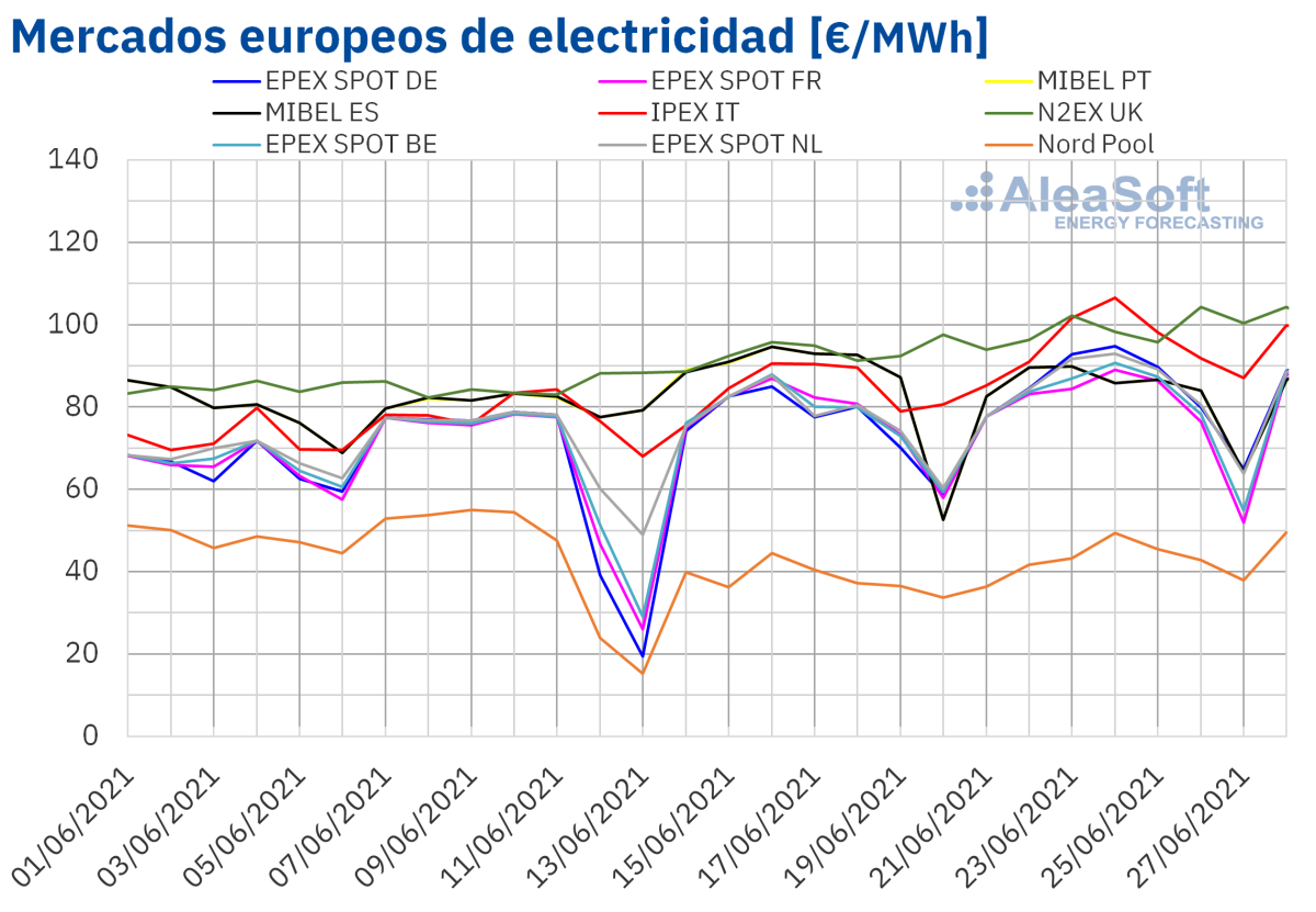 En la cuarta semana de junio, el incremento de los precios del gas y de los derechos de emisión de CO~2~ favoreció el incremento de los precios en los mercados eléctricos europeos. Además, el descenso de la producción eólica y solar en países como Alemania y Francia también contribuyó a las subidas de precios. Sin embargo, el incremento de la producción con estas tecnologías renovables unido a la disminución de la demanda eléctrica en la península ibérica permitió el descenso de los precios en el mercado MIBEL.