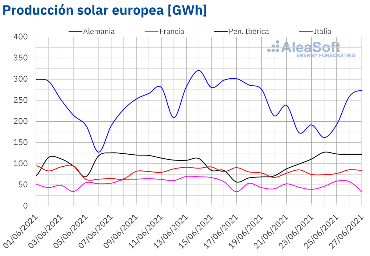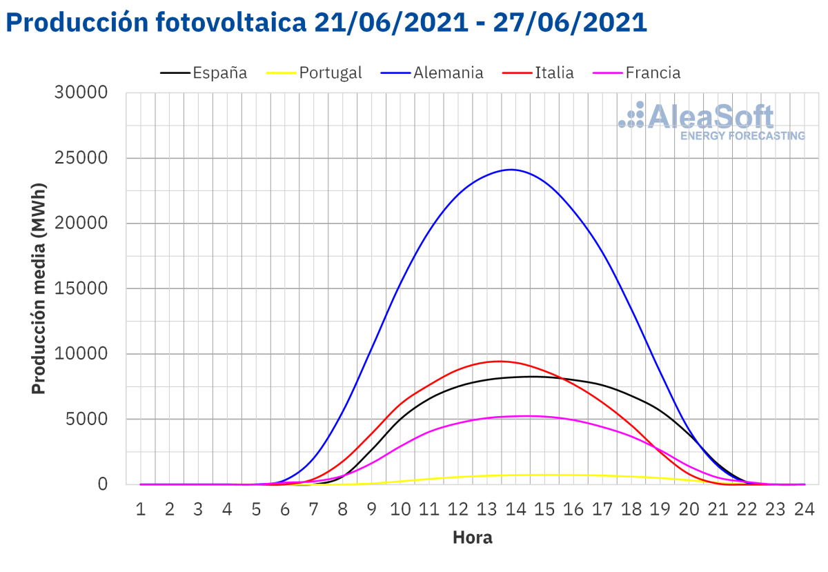 Durante la semana del 21 de junio se registraron incrementos de la producción solar en los mercados de España y Portugal de un 45% y un 44% respectivamente, en comparación con la tercera semana de junio. Sin embargo la producción con esta tecnología disminuyó en la mayoría de los mercados analizados. En el mercado alemán descendió un 25%, mientras que en los mercados de Francia e Italia las bajadas fueron del 8,7% y 3,7% respectivamente.