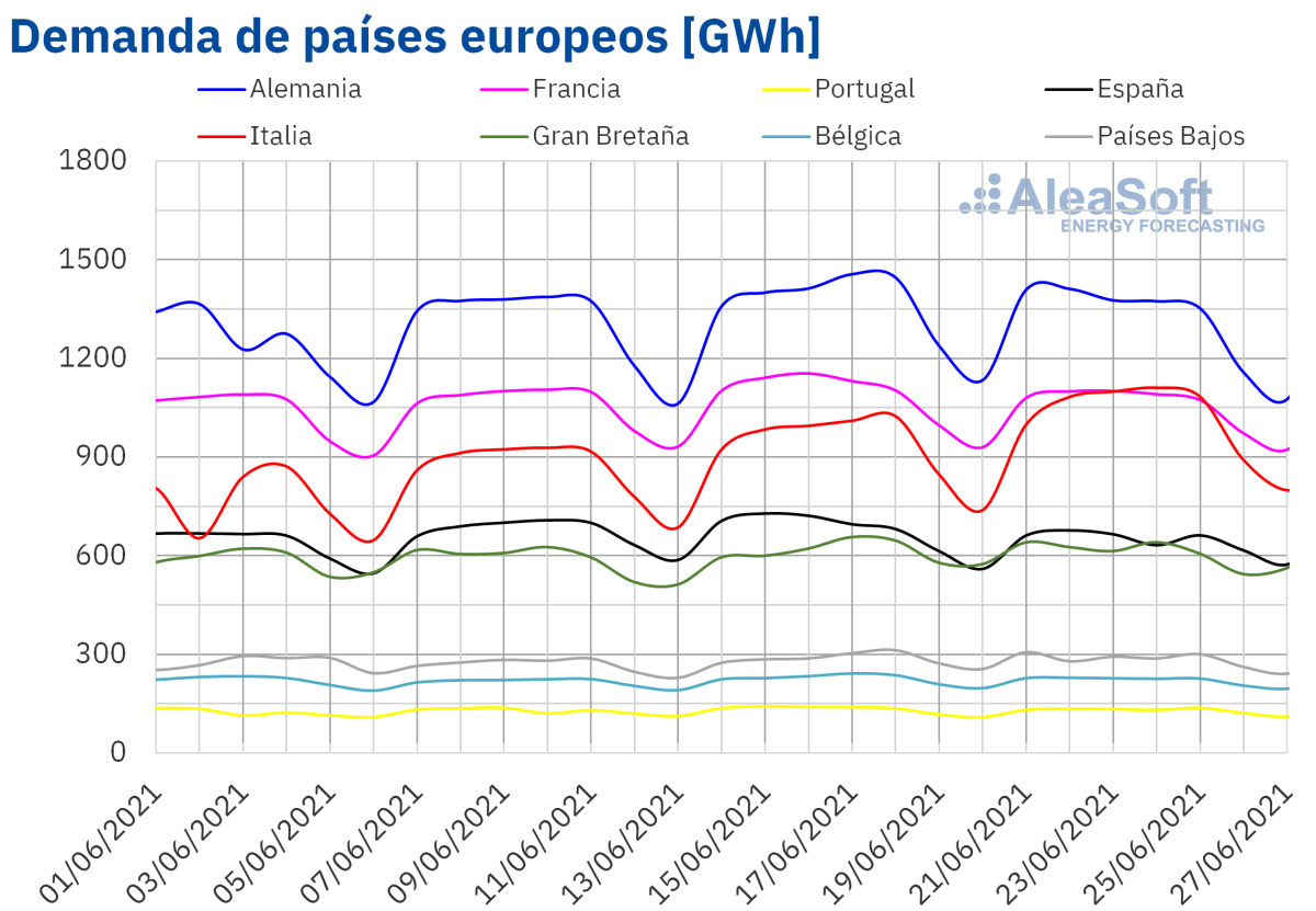 En la semana del 21 de junio, la demanda eléctrica cayó en la mayoría de los mercados europeos respecto a la semana anterior. El descenso de las temperaturas medias semanales, que llegó hasta 5,1 °C en Bélgica, fue la causa principal de las bajadas de la demanda. Los mercados de España, Alemania y Francia tuvieron los descensos más notables, que estuvieron entre el 3,0% y 5,0%. En el caso de España, el festivo de San Juan, celebrado en varias regiones el día 24 de junio, también favoreció el descenso de la demanda. Sin embargo, en el mercado de Italia, donde las temperaturas medias aumentaron, la demanda se incrementó en un 8,3%.