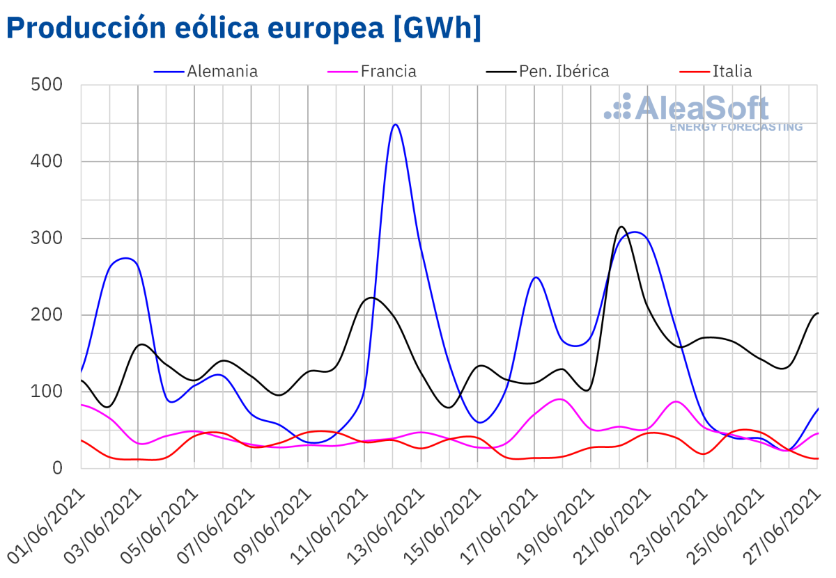 Durante la cuarta semana de junio, la producción eólica aumentó un 33% en el mercado italiano, un 24% en el mercado portugués y un 19% en el mercado español en comparación con la semana del 14 de junio. Por el contrario, en el mercado alemán la producción cayó un 38% porque, a pesar de que entre el lunes y el martes de la semana se registró una producción eólica relativamente alta, durante el resto de los días la producción estuvo por debajo de los 80 GWh. En el mercado francés también descendió la producción con esta tecnología, en este caso un 7,0%.