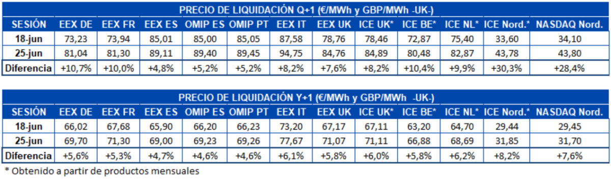 Durante la cuarta semana de junio los precios de los futuros de electricidad para el próximo trimestre registraron una importante subida en todos los mercados europeos analizados en AleaSoft si se comparan los precios de cierre de las sesiones del 18 y 25 de junio El mayor incremento en términos porcentuales ocurrió en el mercado ICE de los países nórdicos, con un 30% de subida, seguido de cerca por el mercado NASDAQ de la misma región con un 28%. En el resto de mercados las subidas estuvieron entre el 4,8% y el 11%, siendo el mercado EEX de España el de menor aumento.