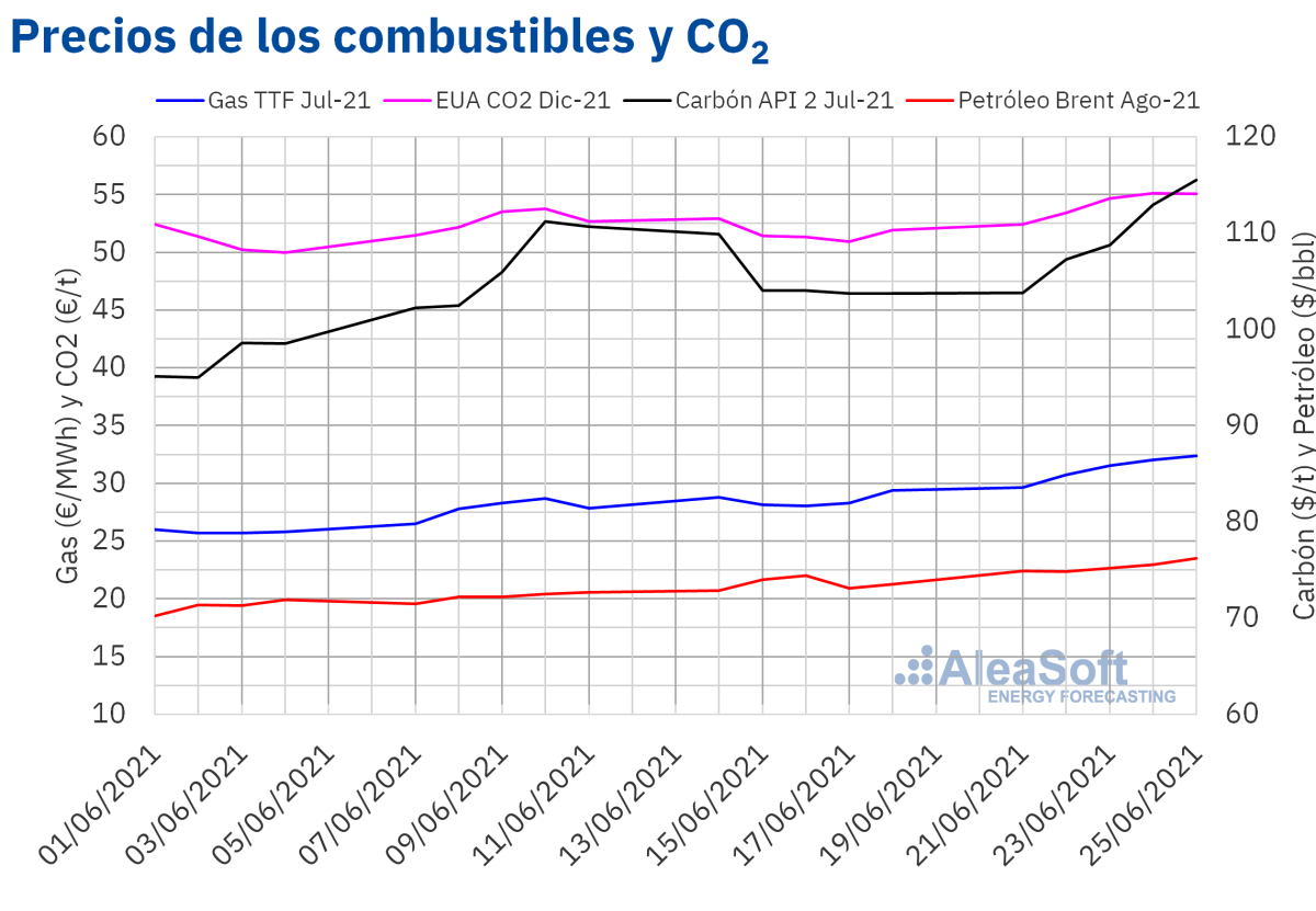 Por lo que respecta a los precios de los futuros de derechos de emisión de CO~2~ en el mercado EEX para el contrato de referencia de diciembre de 2021, durante la cuarta semana de junio, aumentaron hasta alcanzar un precio de cierre de 55,09 €/t el jueves 24 de junio. Este precio fue un 8,2% mayor al del jueves anterior y el más alto desde mediados de mayo. Sin embargo, el viernes se produjo un ligero descenso hasta los 55,05 €/t.