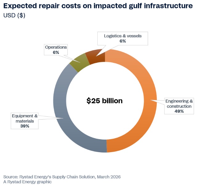 Según estimaciones de Rystad Energy, los costes de reparación y restauración de la infraestructura energética hasta la fecha podrían alcanzar al menos los 25.000 millones de dólares, basándose en una evaluación inicial de las instalaciones afectadas, y se espera que aumenten aún más. Es probable que el gasto esté impulsado principalmente por la ingeniería y la construcción, seguidas de equipos y materiales.