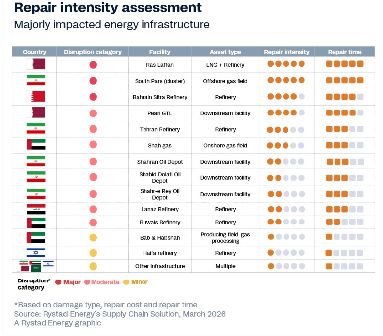 Al evaluar los costes de reparación y los plazos completos de restauración según los distintos niveles de gravedad, destaca claramente un caso excepcional en la ciudad industrial de Ras Laffan, en Qatar, donde la destrucción de las plantas de GNL S4 y S6 ha provocado una situación de fuerza mayor y una reducción del 17% en la capacidad, equivalente a aproximadamente 12,8 millones de toneladas anuales (Mtpa).