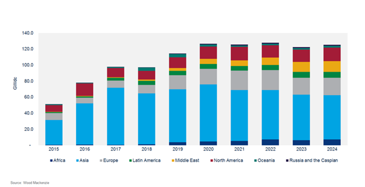 Como Wood Mackenzie ha señalado en su informe 'Actualización de las perspectivas del mercado mundial de la energía solar fotovoltaica: 2º trimestre de 2019’, el mercado está ahora de nuevo en una trayectoria de crecimiento fuerte tras una desaceleración en 2018. Las instalaciones anuales a partir de 2020 alcanzarán un ritmo de unos 125 GW anuales.