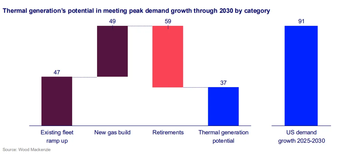 Con EEUU preparándose para aproximadamente 90 gigavatios (GW) de crecimiento de la demanda máxima hasta 2030, la generación a gas y carbón solo podrá cubrir unos 37 GW de ese crecimiento, según un nuevo informe de Wood Mackenzie.