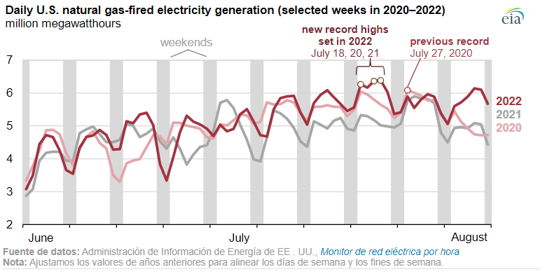La demanda de electricidad de EEUU generalmente alcanza su punto máximo en el verano debido a la demanda de aire acondicionado. El pasado julio fue especialmente caluroso, clasificándose como el tercero más caluroso registrado en los Estados Unidos. Antes de este año, el pico diario anterior para la generación de electricidad a base de gas natural había ocurrido el 27 de julio de 2020, cuando los precios del gas natural eran históricamente bajos.