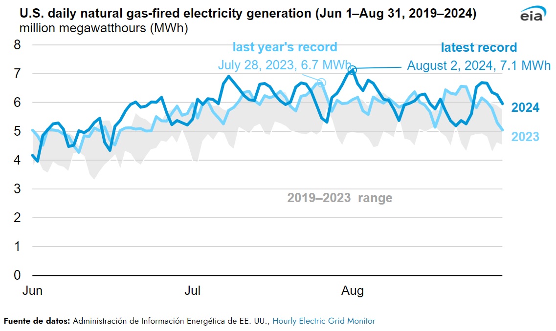 El 2 de agosto de 2024, se generaron 7,1 millones de MWh de electricidad a gas natural en Estados Unidos, un 6,8 % más que el récord del verano anterior establecido el 28 de julio de 2023. Nueve de los diez días con la mayor generación de electricidad a gas natural registrada en Estados Unidos ocurrieron en el verano de 2024; de ellos, seis ocurrieron en agosto. La generación de electricidad general para el verano (junio-agosto) de 2024 aumentó un 3 % con respecto al verano de 2023. El promedio diario de generación de electricidad a gas natural para el verano también aumentó un 3 % a 5,9 millones de MWh.