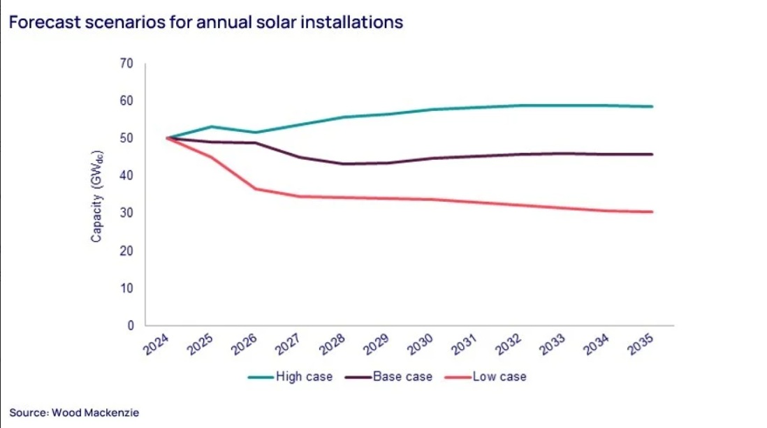 Un caso alto en el que los créditos fiscales se mantengan sin cambios, aumente la disponibilidad de financiación y la oferta de productos solares siga siendo alta aumentaría las perpectivas en un 24%, dicen los analistas de Woodmac.