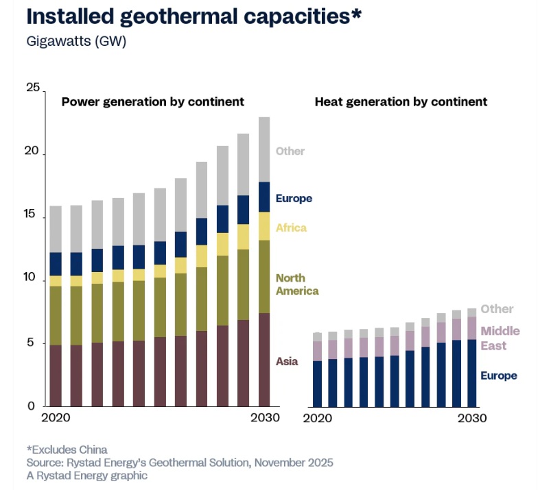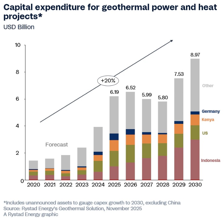 La inversión geotérmica global está entrando en un período de crecimiento acelerado, con un gasto de capital (capex) que se espera que aumente aproximadamente un 20% anual hasta 2030, según el último modelo económico geotérmico de Rystad Energy. Este impulso se produce a medida que la energía geotérmica, producida mediante el aprovechamiento del calor de las profundidades de la tierra, ya no se define únicamente por centros consolidados en el Sudeste Asiático y Estados Unidos.