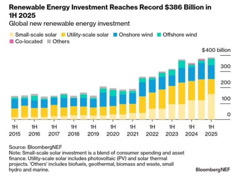 La inversión global alcanzó un récord de 386.000 millones de dólares durante el primer semestre de 2025, lideradas por la eólica marina y la solar a pequeña escala, según BloombergNEF