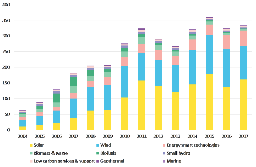 La inversión global en energías renovables y tecnologías inteligentes alcanzó los 333.500 millones en 2017, un 3% más que en 2016 y la segunda cifra anual más alta, tras el récord de 360.300 millones alcanzado en 2015, según un informe de Bloomberg New Energy Finance (BNEF).