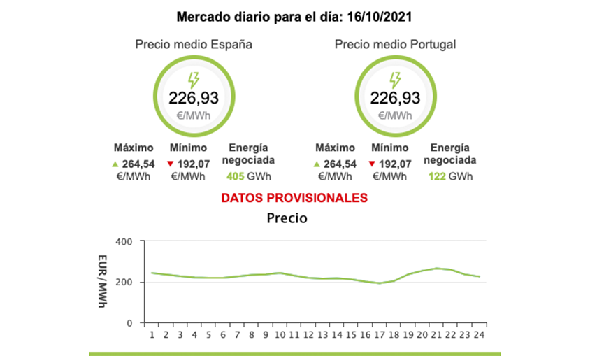 El precio más alto de este sábado se dará entre las 20.00 y las 21.00 horas, cuando alcanzará los 264,54 euros/MWh, mientras que el más bajo se registrará entre las 16.00 horas y las 17.00 horas, con 192,07 euros/MWh.