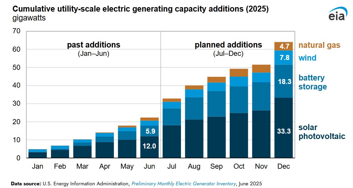 Los desarrolladores agregaron 12 gigavatios (GW) de nueva capacidad de generación eléctrica solar a escala comercial en Estados Unidos durante la primera mitad de 2025, y planean agregar otros 21 GW en la segunda mitad del año, según la última encuesta sobre cambios en la capacidad de generación eléctrica de la EIA. Si esos planes se concretan, la energía solar representaría más de la mitad de los 64 GW que los desarrolladores planean poner en funcionamiento este año. El almacenamiento en baterías, la energía eólica y las plantas de energía a gas natural representan prácticamente el resto de las adiciones de capacidad previstas para 2025.