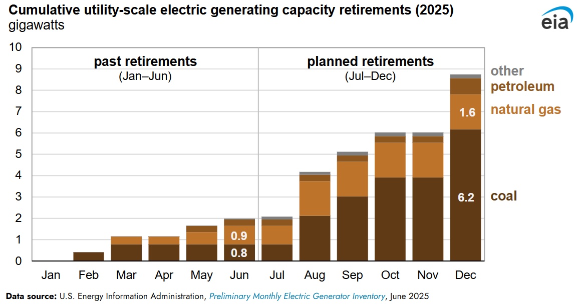 Los desarrolladores retiraron relativamente poca capacidad de generación en la primera mitad de 2025. De los 8,7 GW de capacidad de generación eléctrica que los operadores de EEUU planean cerrar durante 2025, solo se retiraron 2,0 GW en la primera mitad del año. En comparación con los planes de cierre de capacidad para 2025 reportados a principios del año, más de 3,6 GW se han retrasado o cancelado, incluyendo los planes para retirar las unidades 1 y 2 a carbón de Brandon Shores (1,3 GW) y las unidades 3 y 4 a petróleo de Herbert A. Wagner (0,7 GW) en Maryland, así como las unidades 1, 2 y 3 a gas natural de la planta V.H. Braunig (0,9 GW) en Texas. Si se concretan las intenciones actuales de cierre, las plantas eléctricas a carbón representarán el 71% de la capacidad cerrada este año, seguidas por las de gas natural (19%).