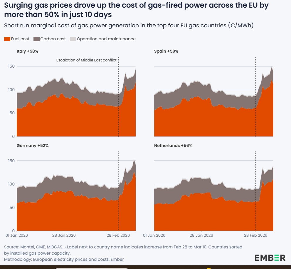 La reciente escalada del conflicto en Oriente Medio ha provocado un fuerte aumento de los precios del gas, reavivando las preocupaciones sobre la dependencia energética de la Unión Europea. En los primeros diez días de la crisis, el encarecimiento de los combustibles fósiles ya ha incrementado en unos 2.500 millones de euros la factura de importaciones energéticas del bloque, según Ember.