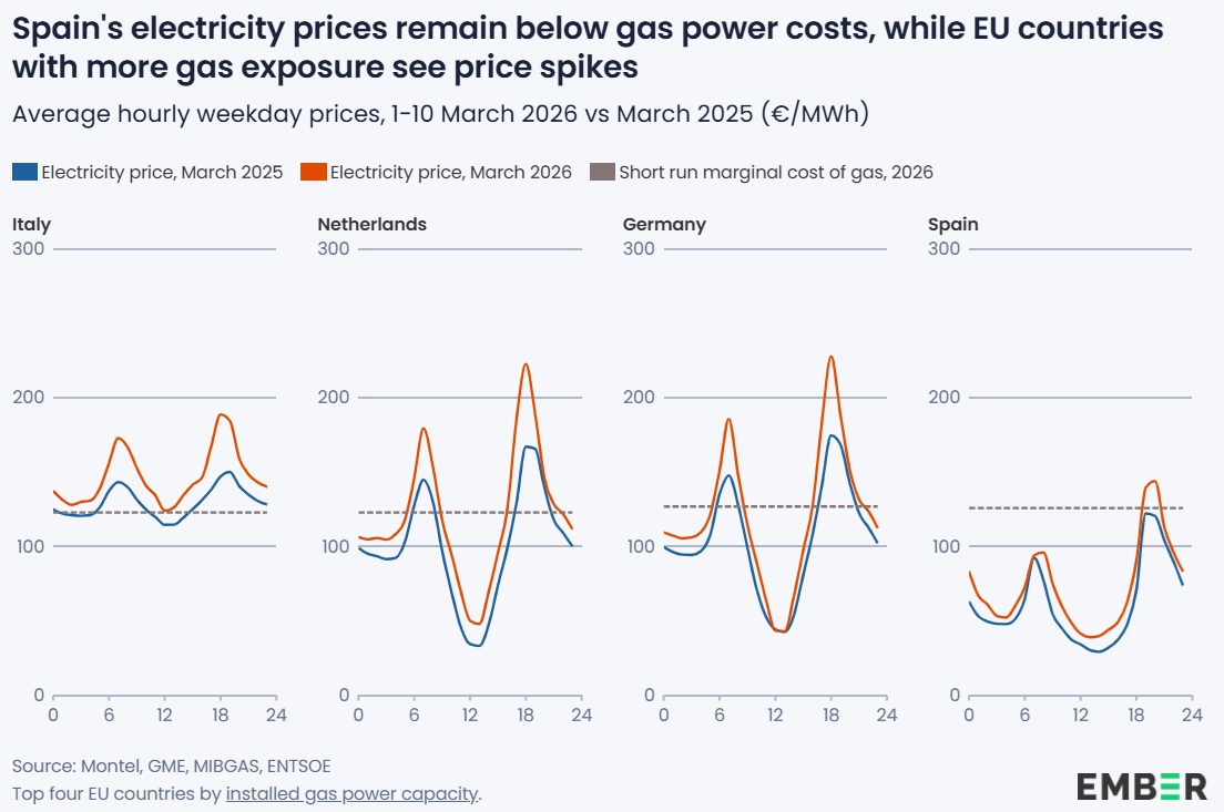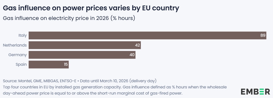 El impacto, sin embargo, no es igual en todos los países. Aquellos con mayor dependencia del gas para producir electricidad son más vulnerables a subidas de precios. En Italia, el gas ha marcado el precio eléctrico en el 89% de las horas de 2026, mientras que en España solo lo ha hecho en el 15%, gracias a una mayor presencia de renovables.