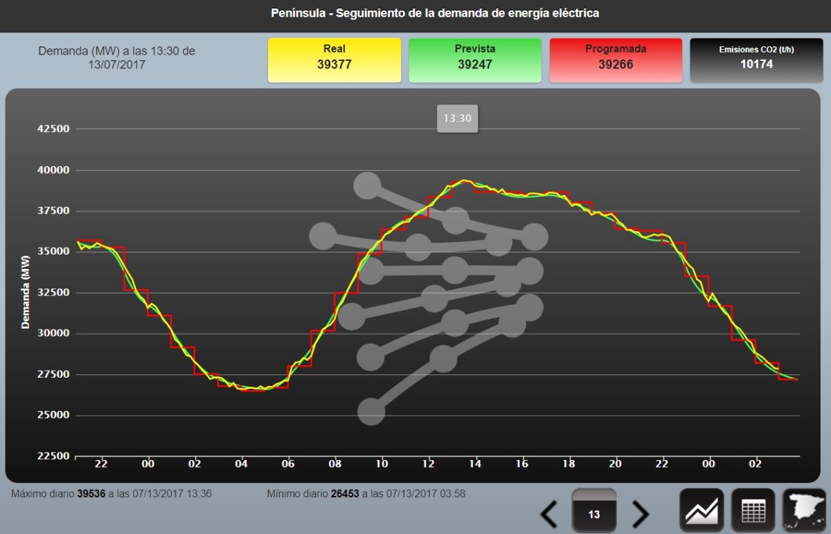 La ola de calor que se inició este miércoles ha batido el récord de demanda eléctrica de este verano. La punta conseguida este jueves, cuando se ha marcado la mayor temperatura registrada en España de la historia, ha sido de 39.536 MW a las 13.36 horas del 13 de julio de 2017.