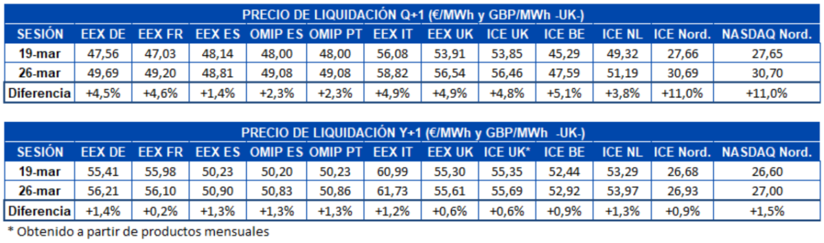 La llegada de la primavera y con ella el aumento de las temperaturas y la producción solar favoreció el descenso de los precios en gran parte de los mercados europeos en la cuarta semana de marzo. Durante el fin de semana varios mercados registraron precios horarios negativos. La tendencia de precios a la baja se mantendrá en la Semana Santa. Por otra parte, los futuros de electricidad subieron de forma generalizada. También registraron subidas el gas y Brent a raíz del buque encallado en el canal de Suez.