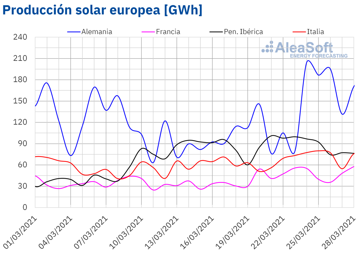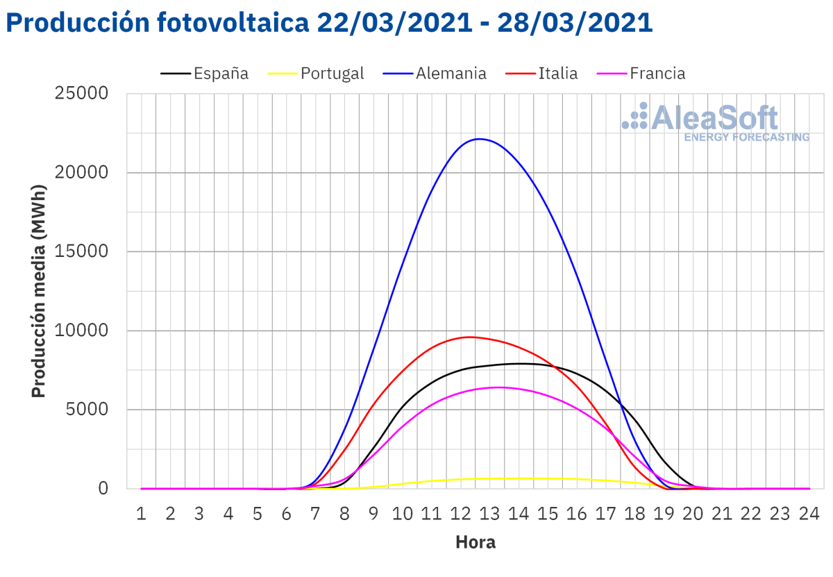 La producción solar, aumentó en todos los mercados durante la semana que comenzó el 22 de marzo en comparación con la semana anterior, excepto en el mercado portugués en el que se redujo un 7,6%. En el mercado alemán la producción solar fue un 50% mayor, mientras que en el francés y el italiano el crecimiento fue de un 36% y un 18% respectivamente. En el mercado español también creció la producción solar, que en este caso incluye a la fotovoltaica y la solar térmica, aunque sólo un 2,0%