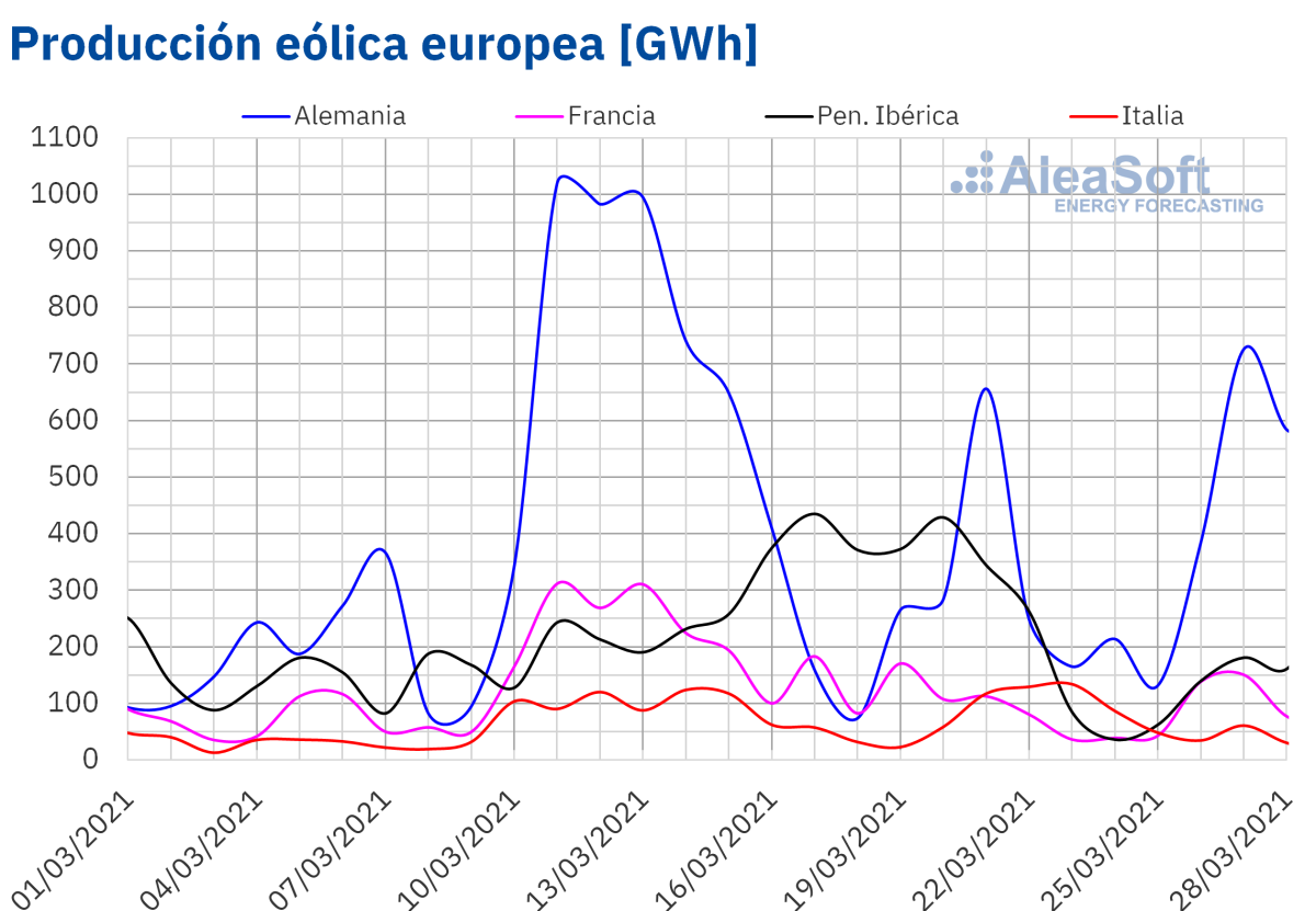 Por el contrario, durante la cuarta semana de marzo, la producción eólica cayó en comparación con la semana precedente en casi todos los mercados analizados en AleaSoft. En la península ibérica la producción con esta tecnología se redujo un 64%, mientras que en el mercado francés cayó un 40% y en el mercado alemán un 1,7%. La excepción fue el mercado italiano en el que se registró un aumento de un 12%.