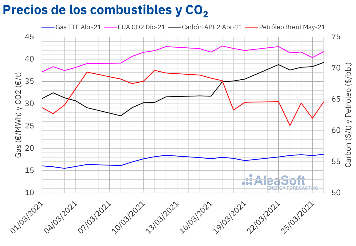 Por lo que respecta a los precios de cierre de los futuros de derechos de emisión de CO~2~ en el mercado EEX para el contrato de referencia de diciembre de 2021, el lunes 22 de marzo alcanzaron el precio de cierre máximo semanal de 42,84 €/t. Sin embargo, durante la cuarta semana de marzo, hubo descensos de precios que permitieron registrar un precio de cierre de 40,35 €/t el jueves 25 de marzo, el cual fue un 4,9% inferior al del jueves anterior. En cambio, el viernes 26 de marzo los precios se recuperaron hasta los 41,73 €/t.