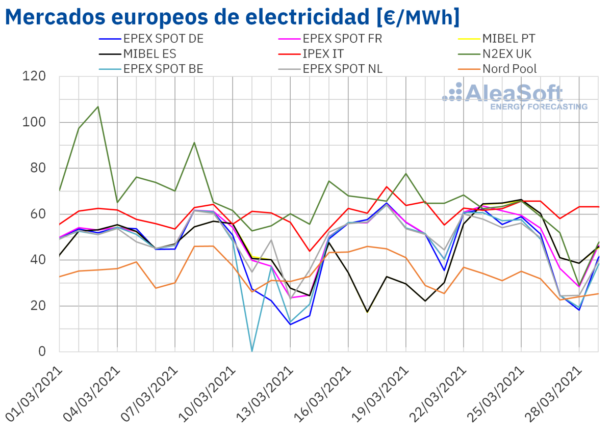 Por otra parte, el sábado 27 de marzo se alcanzaron precios horarios negativos en el los mercados de Alemania, Bélgica y los Países Bajos. El domingo 28 de marzo, además de en estos mercados, también hubo precios horarios negativos en Francia. El precio más bajo, de ‑57,63 €/MWh, se alcanzó en la hora 13 del sábado 27 de marzo en el mercado belga. Este precio horario es el más bajo del mercado belga desde abril de 2020.