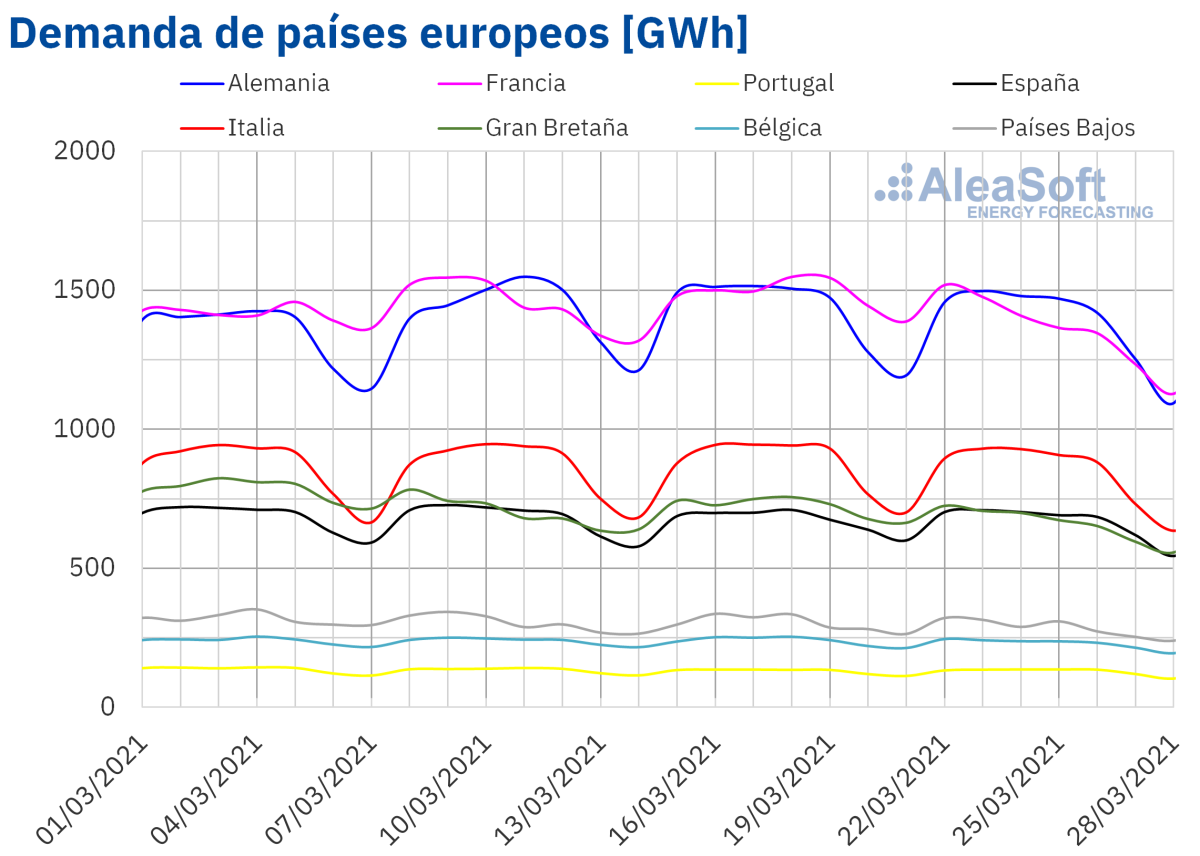 Para la semana del 29 de marzo, las previsiones de demanda de AleaSoft indican que la misma continuará disminuyendo en la mayoría de mercados de Europa. Se espera un aumento de las temperaturas medias y una disminución de la actividad laboral por las festividades asociadas a la Semana Santa en algunos mercados, que contribuirán a esta disminución.