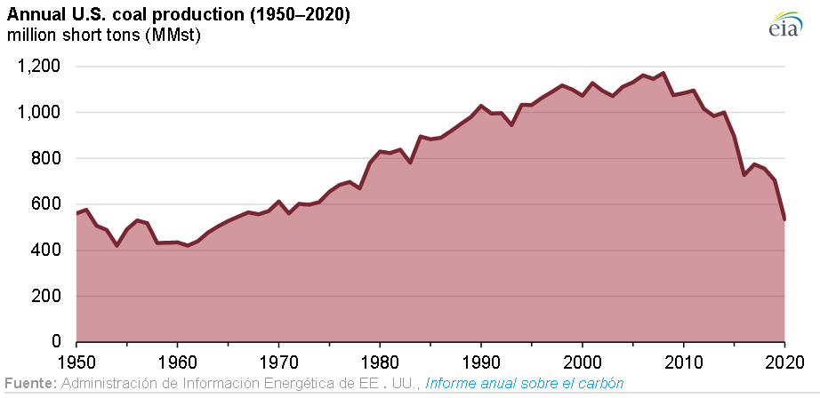 La producción de carbón de EEUU totalizó 535 millones de toneladas cortas (MMst) en 2020, una disminución del 24% con respecto a las 706 MMst extraídas en 2019 y el nivel más bajo de producción de carbón en los Estados Unidos desde 1965, según la Adminisstración de Información de Energía de EEUU (EIA).