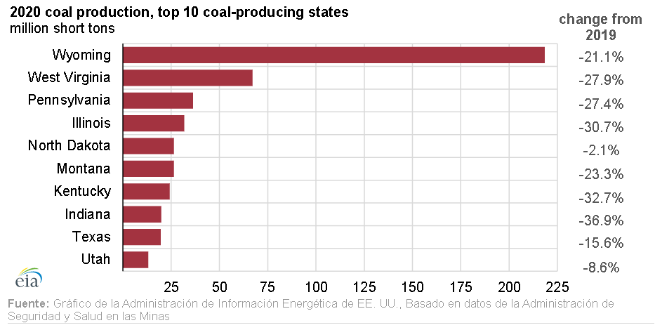 Se produce más carbón en Wyoming, lo que representa el 41% de la producción de carbón de EE. UU. (219 MMst) en 2020, que en cualquier otro estado. La producción de carbón en Wyoming fue un 21% más baja en 2020 que en 2019.