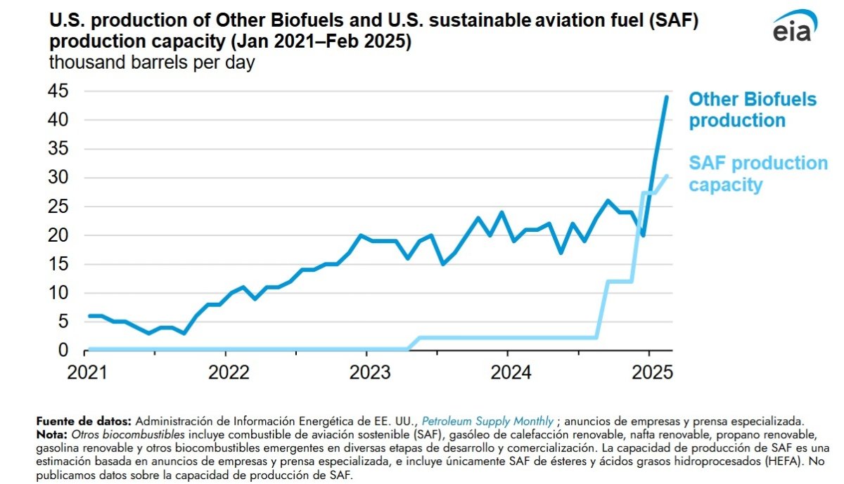 La producción estadounidense de otros biocombustibles, la categoría que la EIA utiliza para registrar SAF, prácticamente se duplicó entre diciembre de 2024 y febrero de 2025