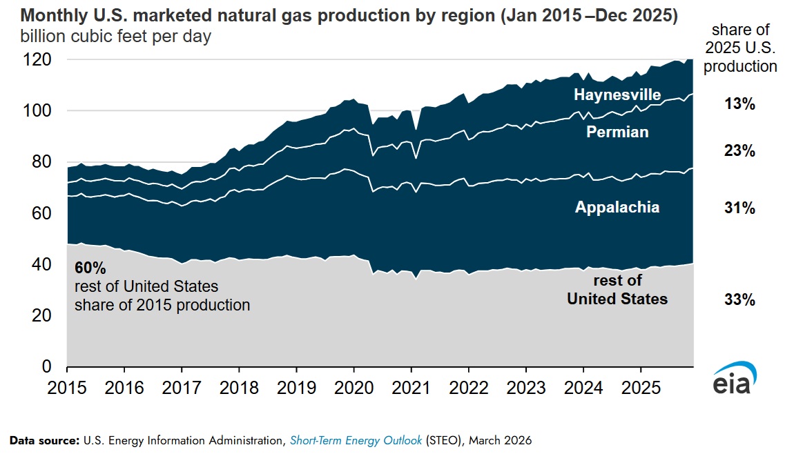La producción de gas natural comercializado en Estados Unidos alcanzó un nuevo récord en 2025, aumentando en 5,3 mil millones de pies cúbicos por día (Bcf/d) hasta un promedio de 118,5 Bcf/d, según el último informe Natural Gas Monthly de la Administración de Información Energética de EEUU (EIA). Tres regiones —Appalachia, Permian y Haynesville— representaron el 67% de la producción total de gas comercializado en Estados Unidos en 2025 y el 81% del crecimiento del año pasado.