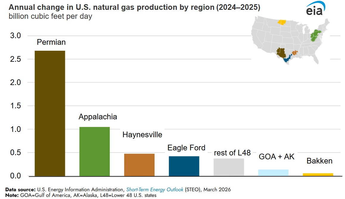 En 2025, los precios spot del Henry Hub aumentaron un 60%, hasta 3,52 dólares por millón de unidades térmicas británicas (MMBtu), lo que contribuyó al crecimiento en todas las regiones. Las regiones de Appalachia, Permian y Haynesville representaron 4,2 Bcf/d del crecimiento, mientras que las demás regiones aportaron el 1,1 Bcf/d restante.