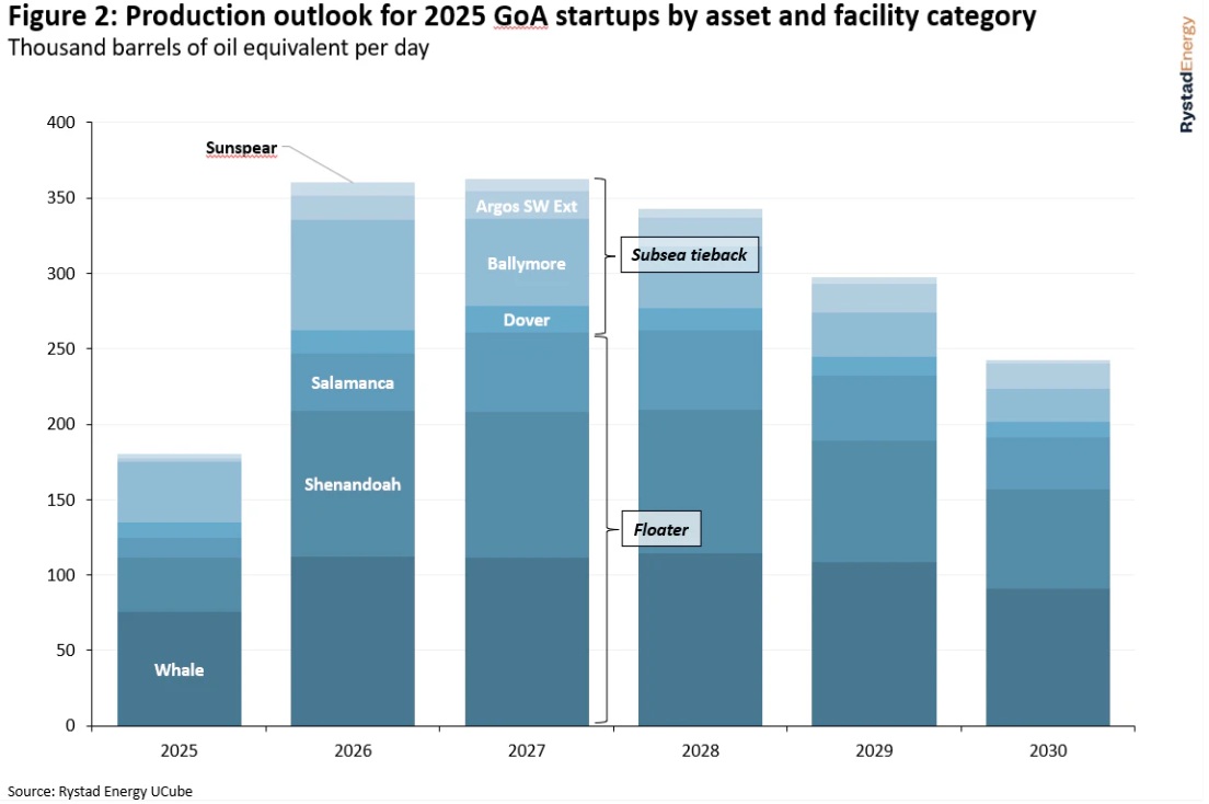 El Golfo de América (GoA) ha tenido un 2025 excepcional en cuanto a actividades de arranque. Tres nuevas unidades flotantes de producción (FPU, por sus siglas en inglés) comenzarán operaciones antes de que termine el año, con el potencial de llevar la producción en aguas profundas de la cuenca a un máximo histórico de casi 2,2 millones de boepd en 2026, según un reciente informe de Rystad Energy.