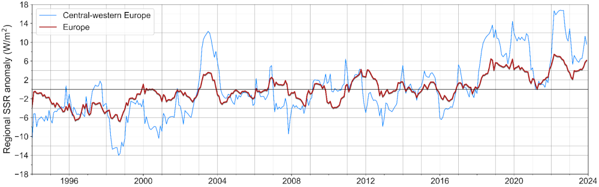 Este aumento de la Radiación Solar en Superficie (SSR), también conocida como Irradiación Global Horizontal (GHI), no ha sido homogéneo en todo el continente ni a lo largo del tiempo. Los resultados indican que Europa centro-occidental experimentó un crecimiento mayor que otras regiones, especialmente durante los últimos 20 años, con el noreste de Francia, el Benelux y el oeste de Alemania registrando un aumento cercano al 4% entre 1994 y 2023, e incluso superior en los últimos 20 años (5%).