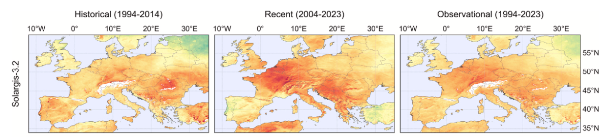Los equipos de las Universidades de Málaga y Murcia y de Solargis recopilaron, depuraron y procesaron datos desde 1994 hasta 2054 basándose en un amplio conjunto de observaciones en estaciones terrestres, cinco conjuntos de datos históricos en malla y 30 modelos climáticos CMIP6 con proyecciones bajo cuatro escenarios distintos de forzamiento.