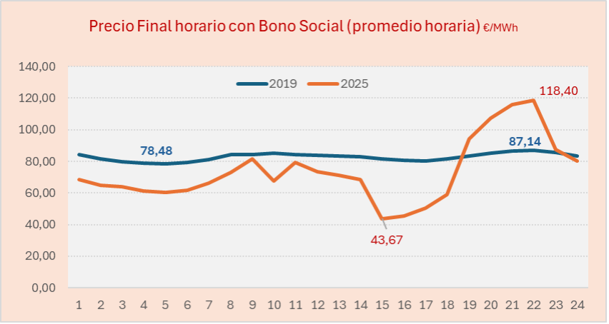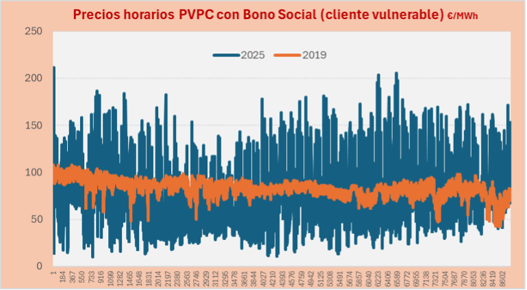 Comparto un gráfico elaborado a partir de los precios horarios de la tarifa aplicando el descuento del bono social sobre la tarifa PVPC para los años 2019 y su comparativa con 2025. En 2019 el descuento era del 25%, durante 2025 estuvo medio año en un 50% y la otra mitad al 42,5%
