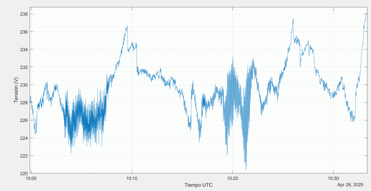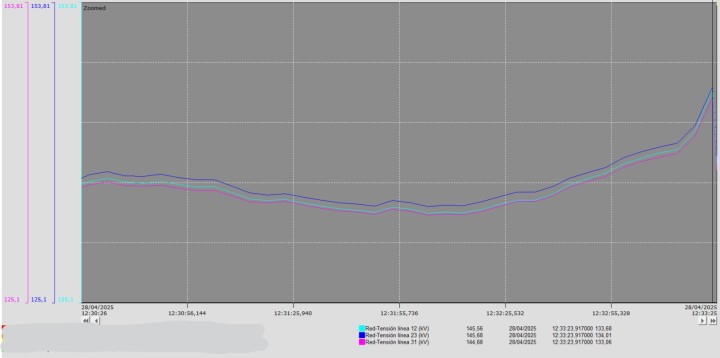 Un momento el del apagón que disparó la tensión en muchos sitios de España. Por ejemplo, en la provincia de Cuenca podemos ver esta gráfica de una línea de 132 kV que justo antes del apagón se fue a niveles de 143 y 144 kV. Lo normal es que se vaya a 135 kV pero no a esos niveles.
