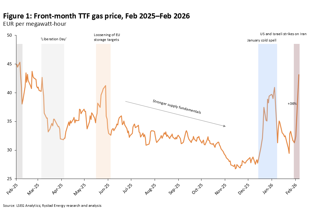 Al cierre del mercado el 2 de marzo, el TTF había subido un 36% respecto a los niveles previos al fin de semana, tras haber cotizado casi un 50% más alto durante el día. La magnitud del movimiento lo sitúa entre los mayores ajustes en una sola sesión del último año.