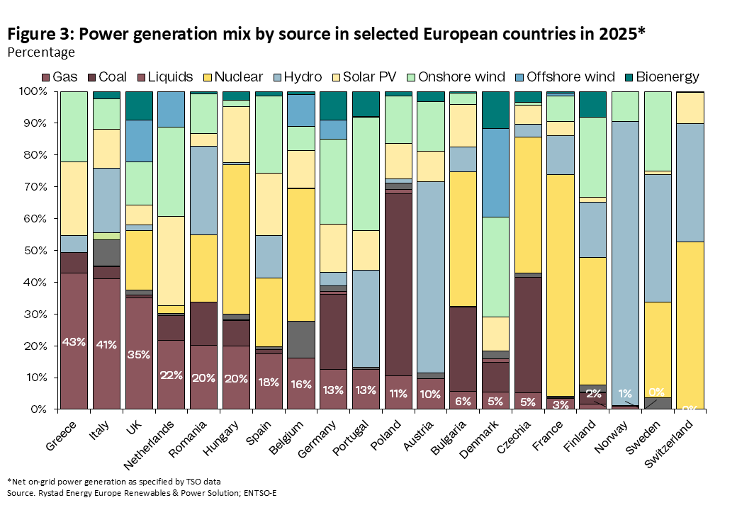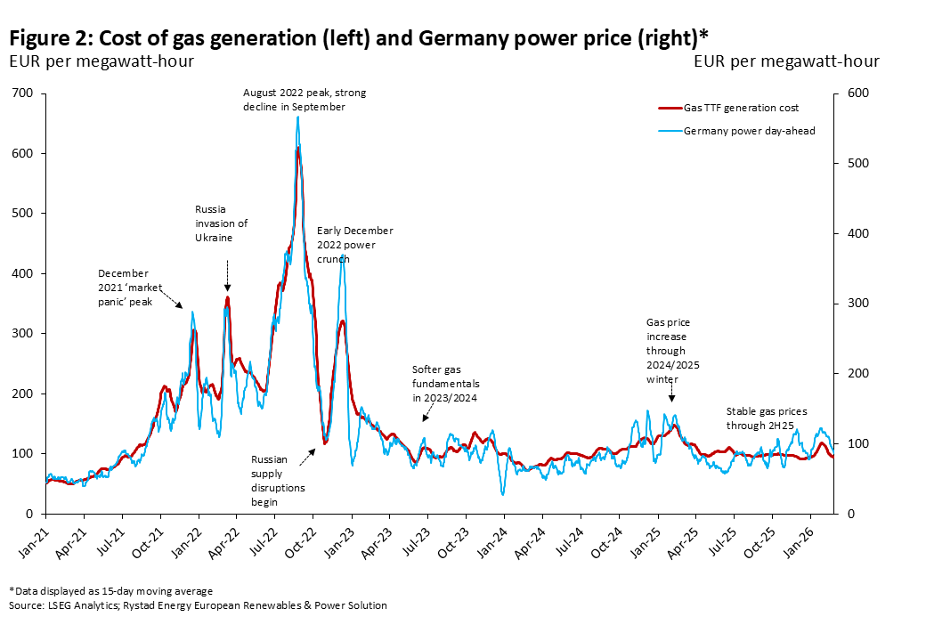 El grado de transmisión depende del papel estructural del gas en cada sistema eléctrico nacional. Como se muestra en la Figura 3, el gas representó alrededor del 41% de la generación eléctrica en Italia el año pasado, el 35% en el Reino Unido, el 13% en Alemania y solo el 3% en Francia. Cuando el gas representa una mayor proporción de la generación, fija con mayor frecuencia el precio marginal y, por tanto, incorpora directamente los movimientos del TTF en los precios mayoristas de la electricidad.