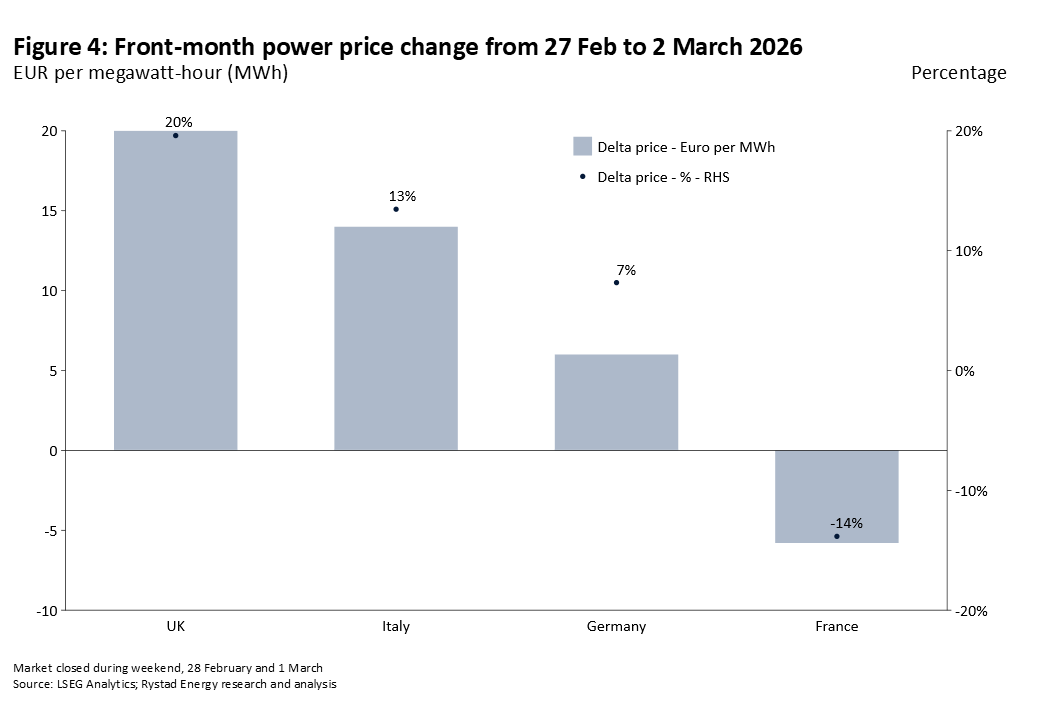 Francia, en cambio, cayó un 14% al cierre del mercado del 2 de marzo. Dado que el gas representa solo una pequeña fracción del mix de generación del país, la transmisión directa desde el TTF hacia los precios mayoristas franceses es estructuralmente limitada. Por ello, la caída sugiere que dinámicas específicas del mercado —incluidas condiciones de liquidez y posicionamiento— desempeñaron un papel mayor que los fundamentos del gas en la reacción a corto plazo.