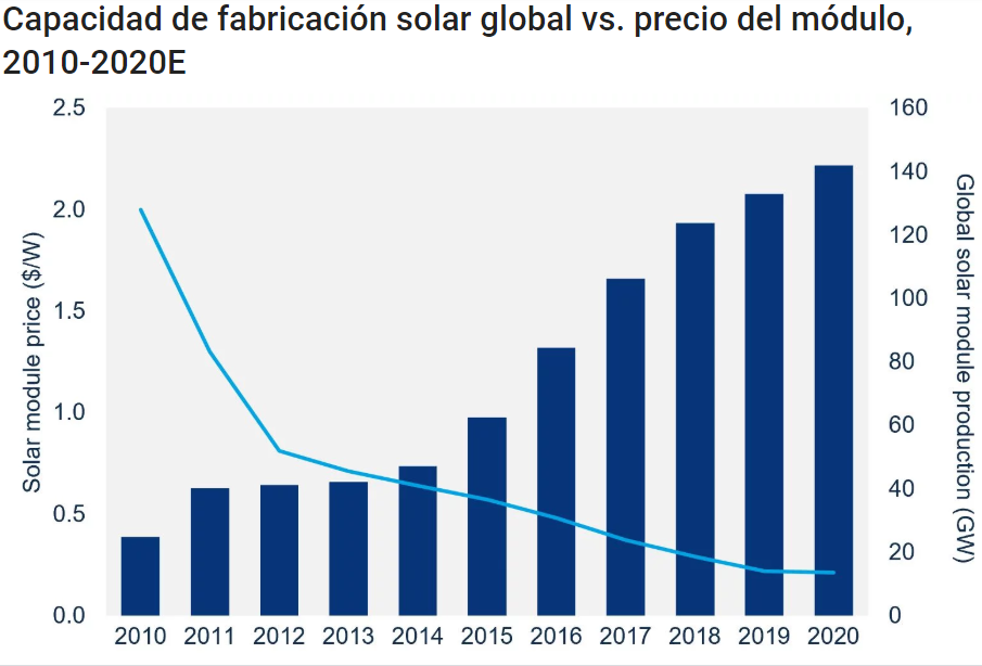 Xiaojing Sun, analista senior de investigación en energía solar de Wood Mackenzie, considera que “la razón principal por la que los módulos solares se hayan vuelto cada vez más competitivos en cuanto a costos se debe a la producción de economías de escala en toda la cadena de suministro”. La capacidad de producción mundial de polisilicio creció más de cuatro veces en la última década, mientras que el precio del polisilicio, la materia prima principal para la producción de módulos solares, disminuyó de más de $ 80 en 2010 a solo $ 8,40 en 2019.