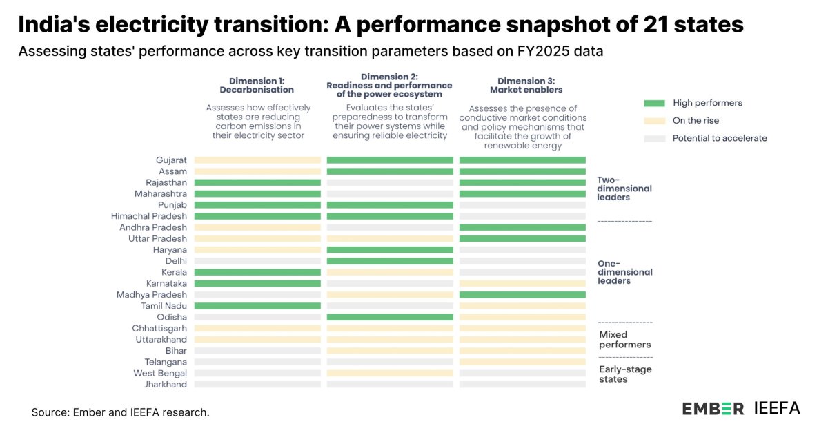 La tercera edición del informe Indian States’ Electricity Transition (SET) de IEEFA y Ember, basada en un marco tridimensional, destaca que mientras algunos estados continúan avanzando de manera constante en el año fiscal (FY) 2025, otros han ganado impulso y establecido una base sólida para un progreso rápido. El avance desigual se debe a diferencias en recursos, prioridades de desarrollo y capacidades institucionales.