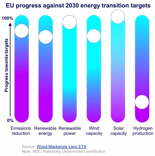 Las nuevas capacidades eólicas alcanzan el 80% de los objetivos fijados para 2030, ya que la eólica marina sufre retrasos por limitaciones en la cadena de suministro, retrasos en la conexión a red y aumento de los costes de capital. Sin embargo, se espera que la energía solar supere los objetivos de 2030 en un 16%, y la cuota renovable en la generación eléctrica va por buen camino.
