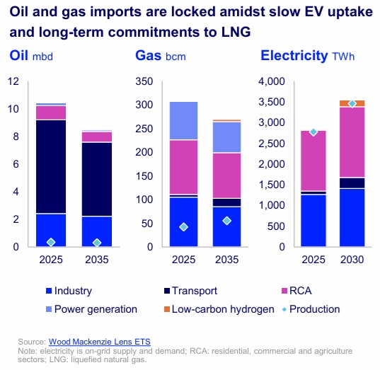 La demanda energética supera el despliegue renovable, mientras persiste la dependencia de combustibles fósiles. La demanda de petróleo probablemente ya ha alcanzado su pico, cayendo un 4% para 2030. Mientras tanto, la demanda de gas se recupera, aumentando hasta al menos 2027 en el escenario base y hasta 2033 en uno más retrasado.