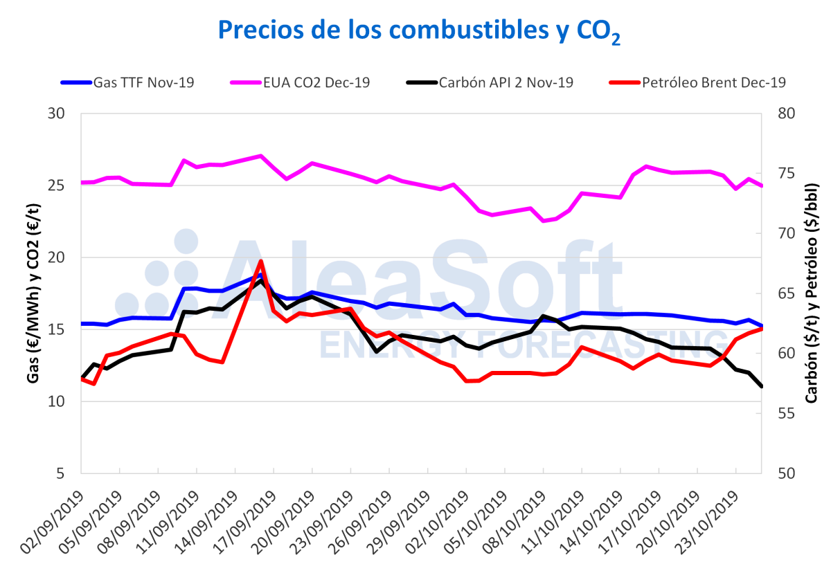 Los precios de los futuros de derechos de emisión de CO~2~ en el mercado EEX para el contrato de referencia de diciembre de 2019, después de dos días seguidos de descensos el martes y miércoles de la semana pasada, el jueves 24 de octubre aumentaron un 2,7% respecto al día anterior. Sin embargo, el viernes 25 de octubre su valor volvió a descender un 1,8% hasta los 24,98 €/t, el segundo precio más bajo de la semana después de los 24,76 €/t del miércoles 23 de octubre. Se espera que los precios suban en el corto plazo después del anuncio de la prórroga del Brexit, hasta el 31 de enero de 2020, aprobada hoy por la Unión Europea.