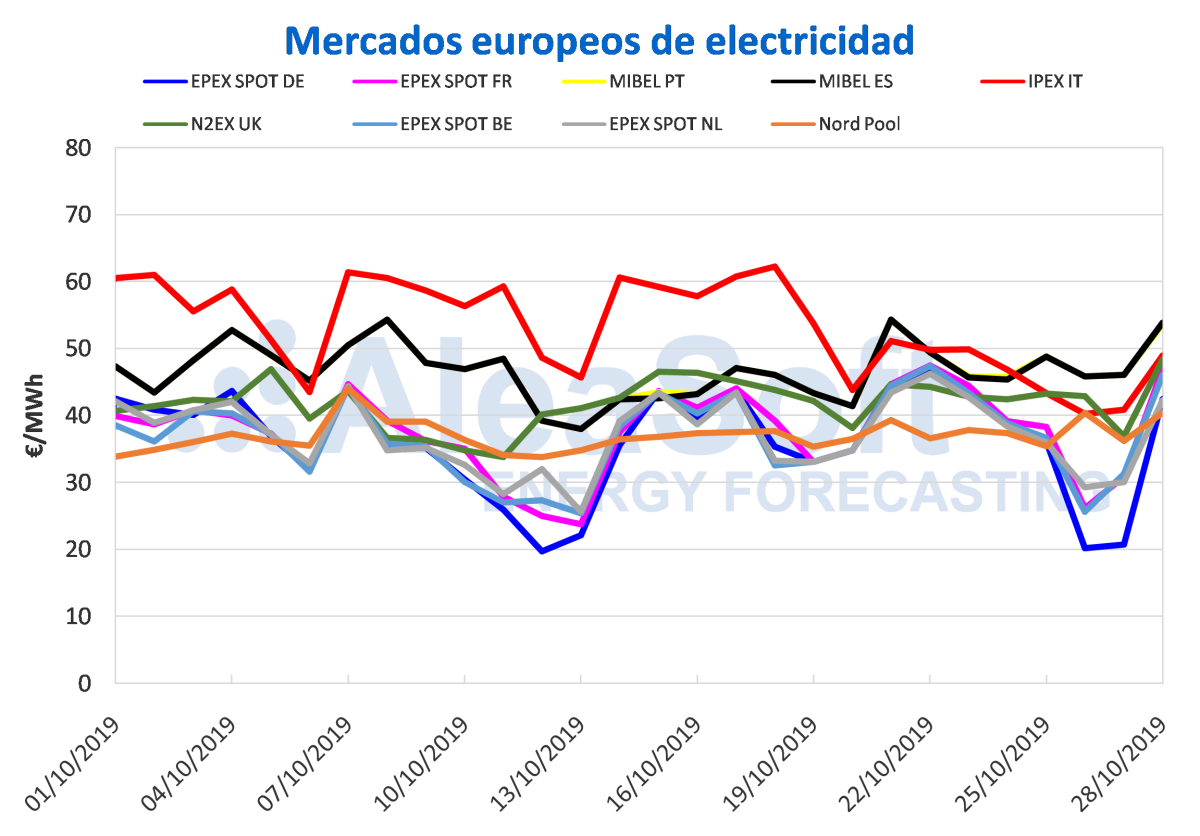 Fuente: Elaborado por AleaSoft con datos de OMIE, EPEX SPOT, N2EX, IPEX y Nord Pool.